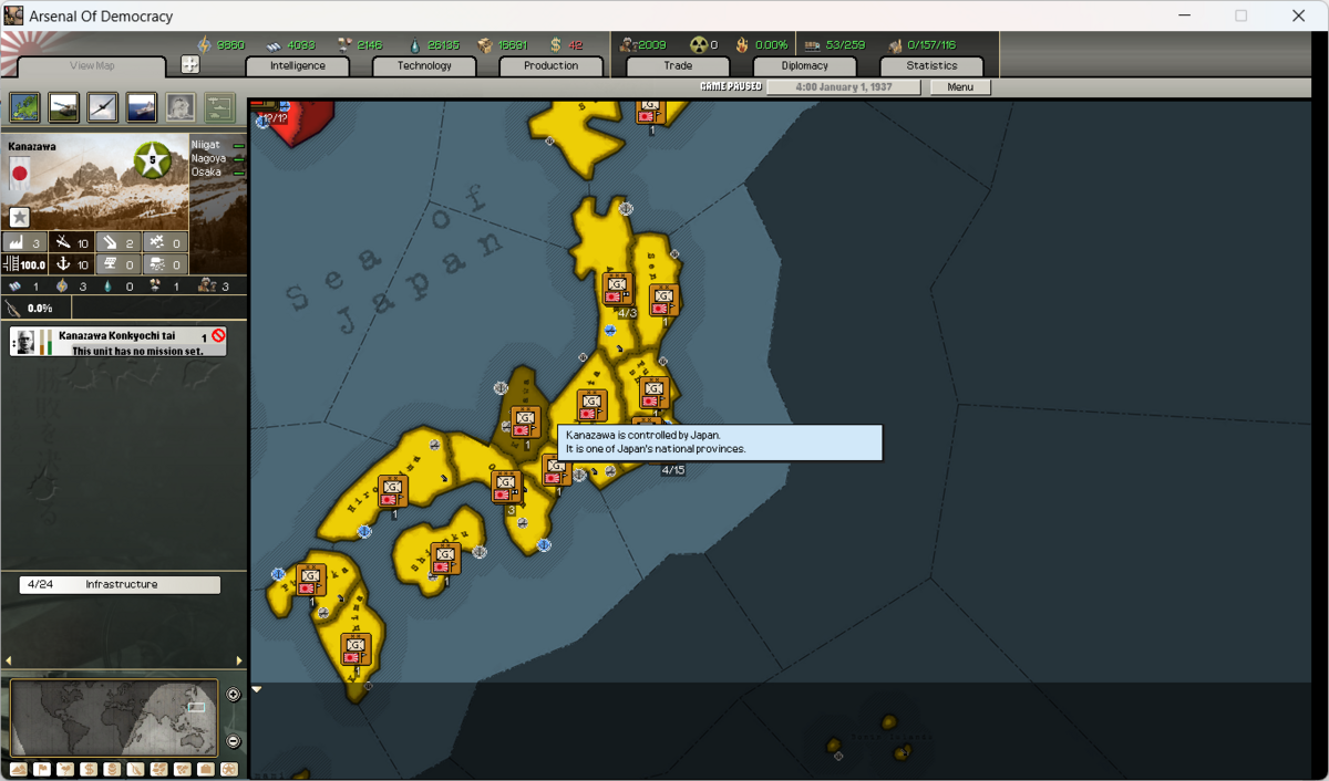 インフラを整備する場所は一応資源があったりICがあるところが基本だが、あまり重要な土地ではないところにもバンバン作っている。プレイヤーがやる際は整理整頓から入るのが必須。AIはそこまで生産キューの整頓をしないので、1年経っても初期生産キューの陸海軍がまったく生産に移っていない。おかげでゲームは軽い。