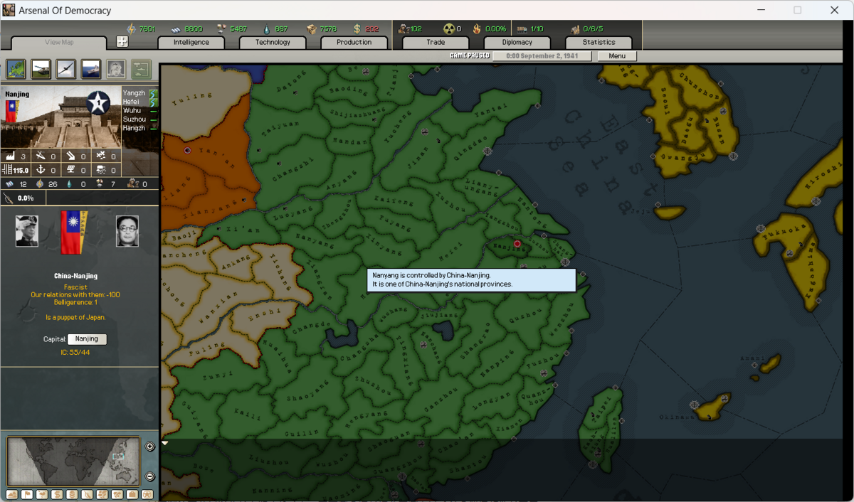 古くは黄河を超えられないこともあったAI日本だが、AOD1.12なら史実を超えて重慶あたりまで侵攻する。すると、北中国+日本の占領地すべてで汪兆銘政権が誕生する。