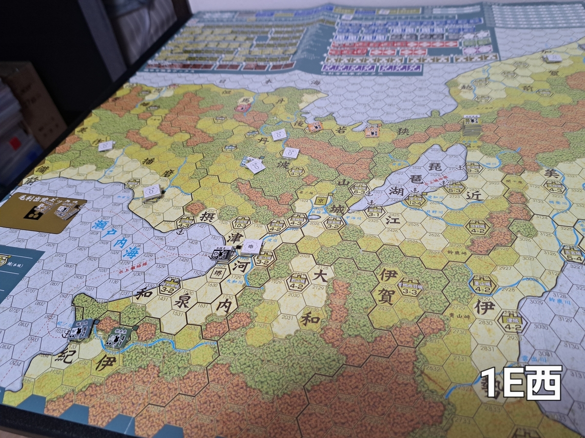 初期配置で相対している織田軍は荒木(3-3)と佐久間(2-3)。比較的弱いので、強力な雑賀衆(6-2)を使って畿内を荒らしたい。京都を取れば5VPが毎ターン入ってくる。
