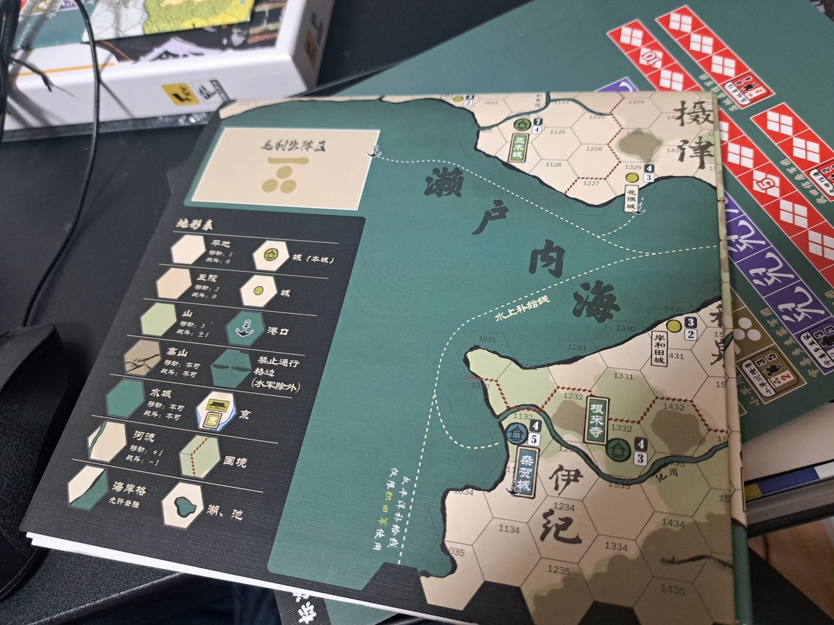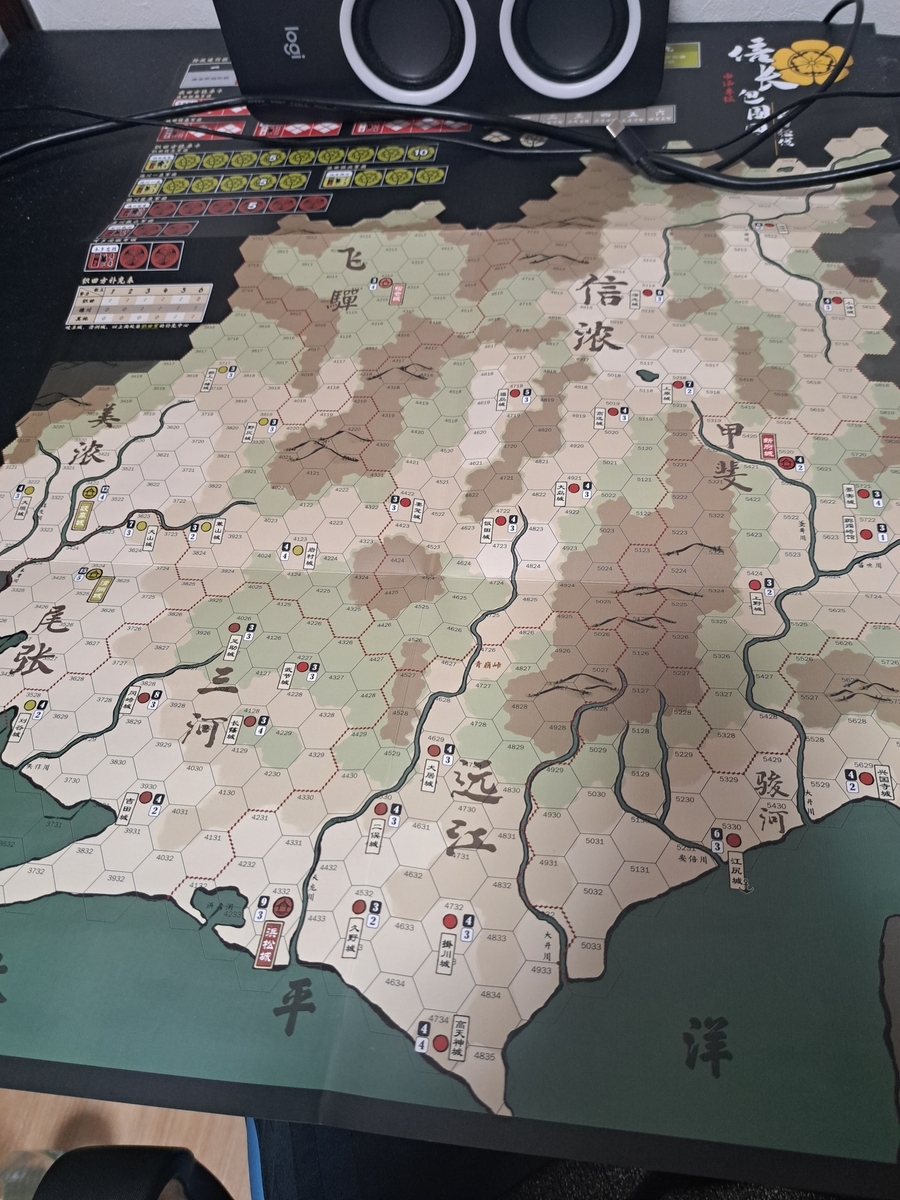 独自のデザインをしたマップ。城の位置とかは変わってなさそう。海の上にヘクスがないのは良いね。水軍はエリア制なので、あのヘクス意味ないんだよな。本城以外の城が単なる○になっちゃったのは少し残念。