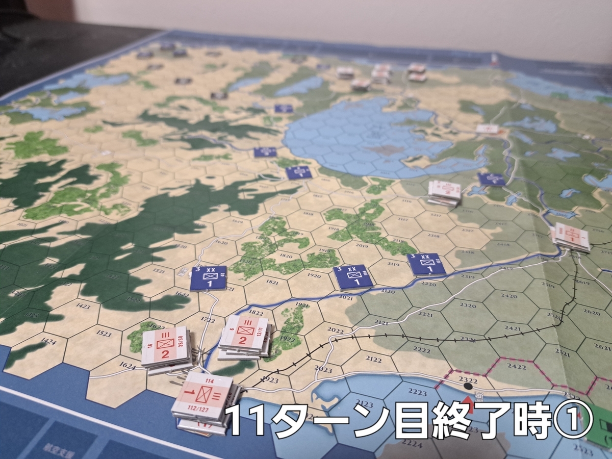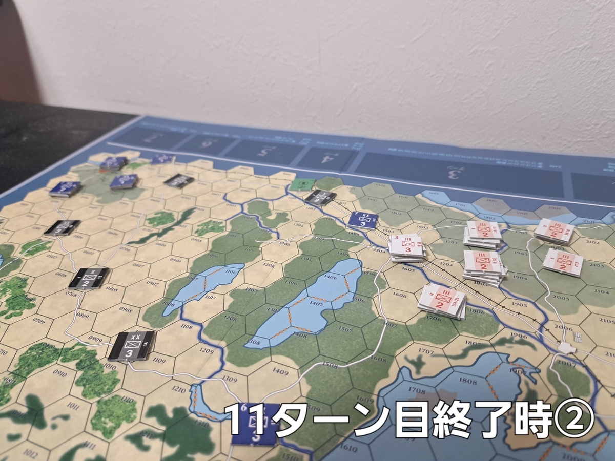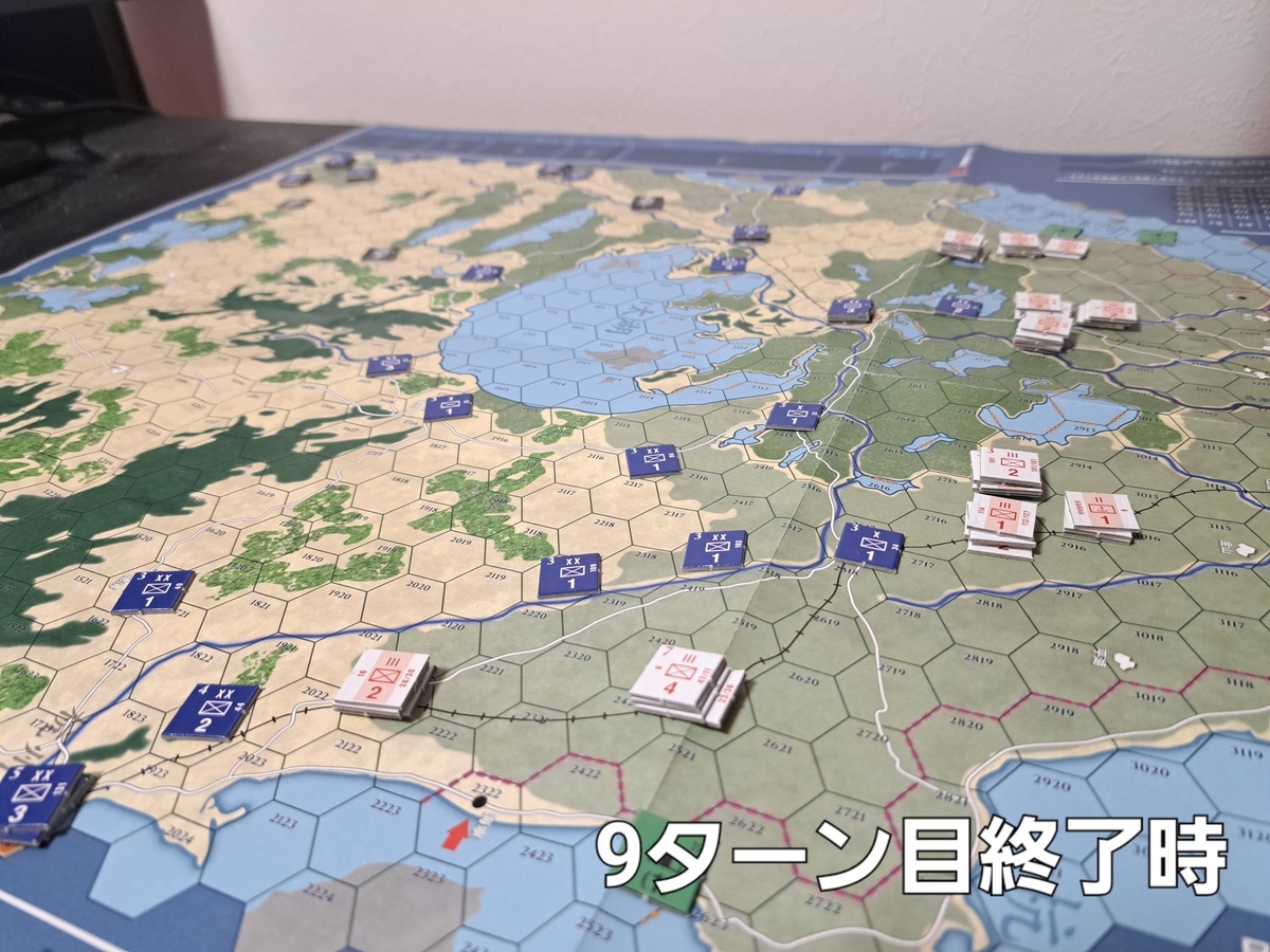 サドンデスのヘクスを守る以外は道路、線路沿いにユニットを配置して遅延していく。*1