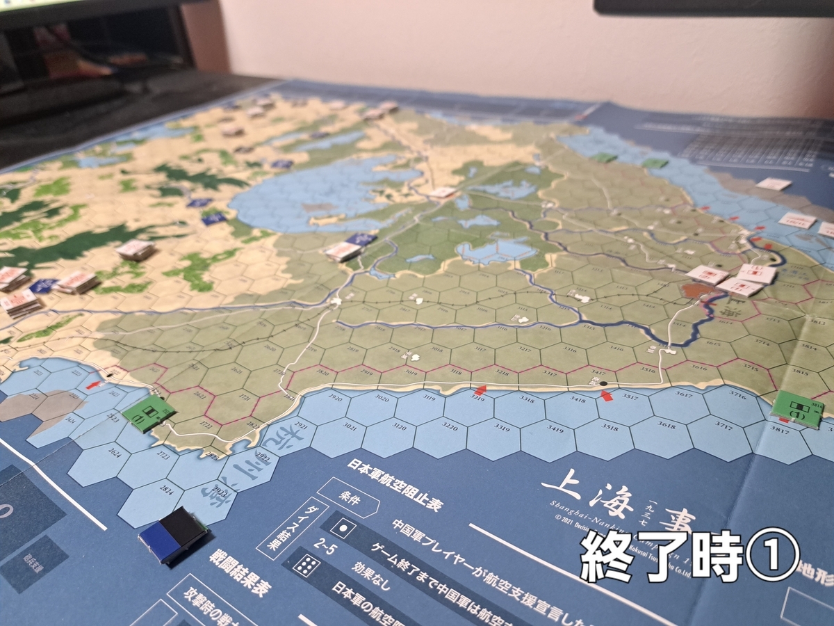 それでも結構面白かったなという印象。今回は中国軍が1ターン目以外反撃できなかったが、日本軍が師団ごとのまとまりを崩して攻撃するようならば中国軍にも反撃の余地があるだろう。プレイ時間が6時間弱かかるので気軽にはできないが。両軍の航空阻止など意外とサイコロを振る回数が多い。